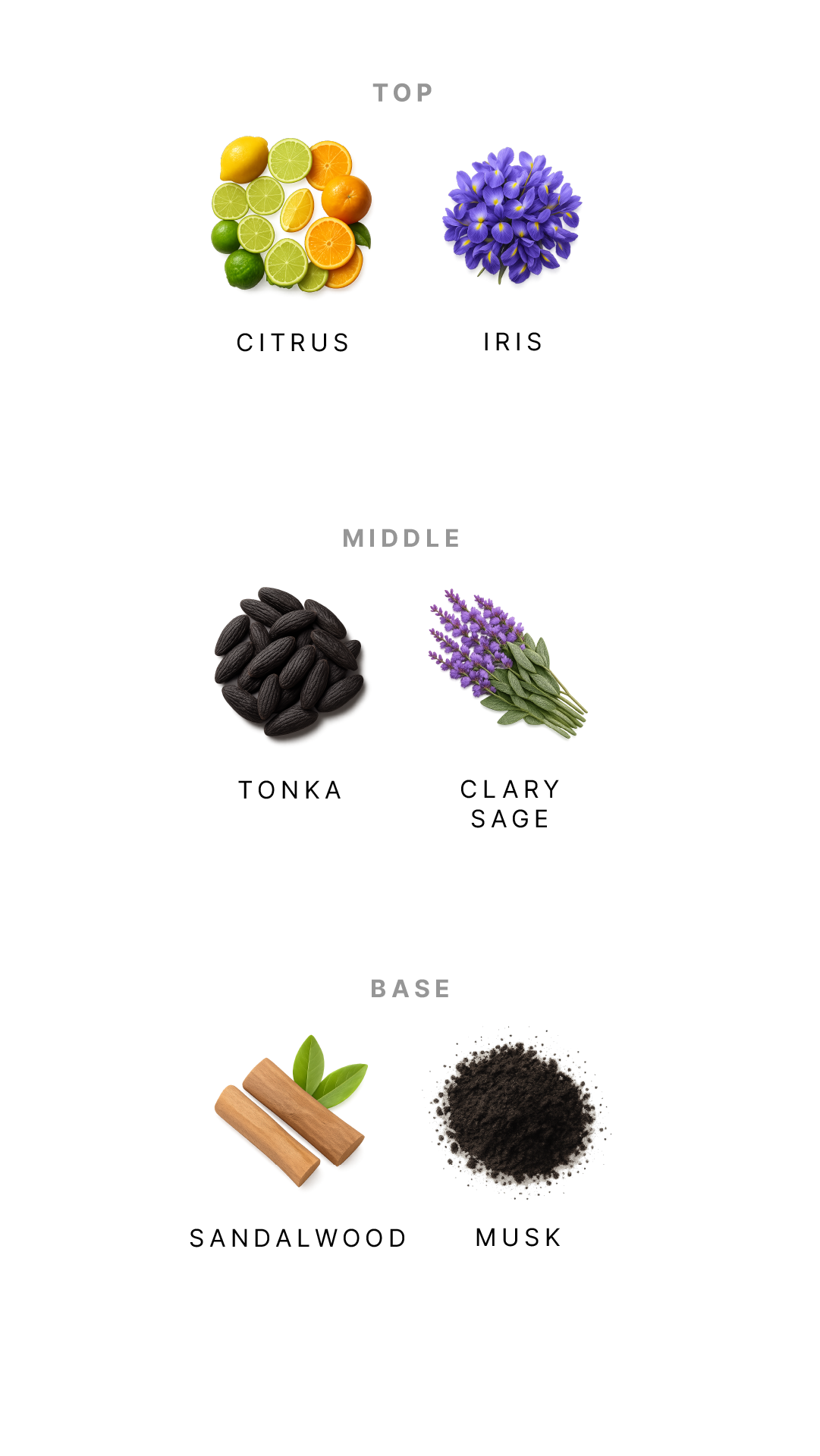 A signature mix of citrus, iris, tonka, and clary sage — refined with sandalwood and musk — built to stay focused, elegant, and wearable all year.