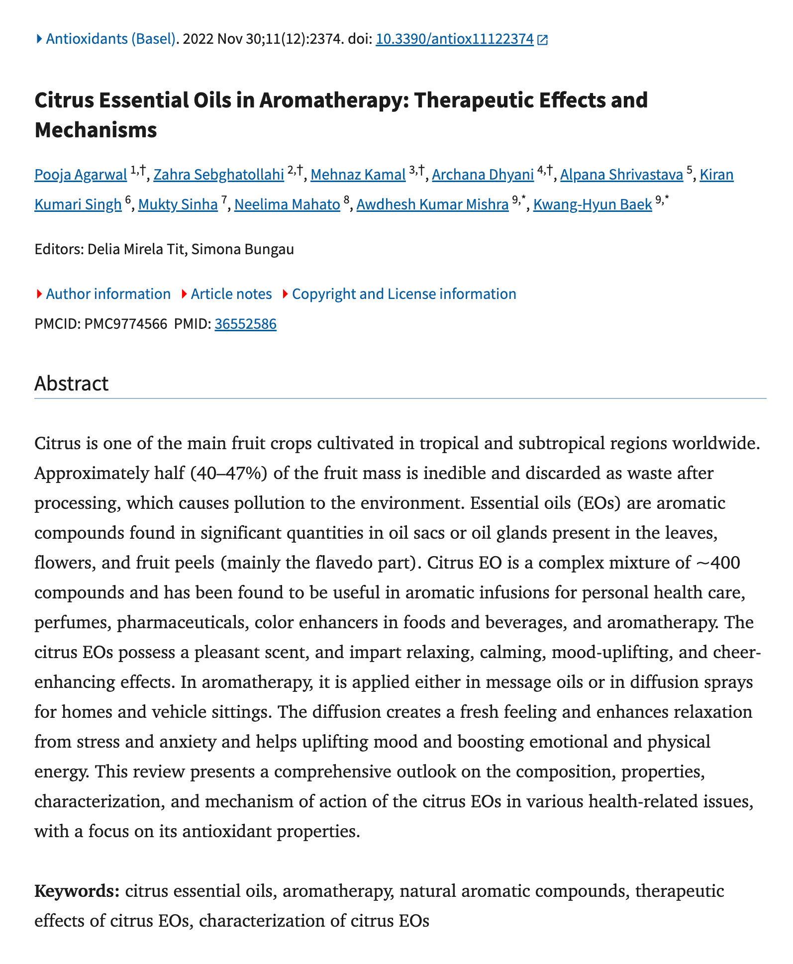 2. Agarwal, P., Sehgalbhattalajit, Z., Kamat, M., Dhyani, A., Shrivastava, A., Singh, K.K., Sinha, M., Mahato, N., Mishra, A.K. & Baek, K.H., 2022. Citrus essential oils in aromatherapy: Therapeutic effects and mechanisms. Antioxidants, 11(12), 2374. Available at: https://doi.org/10.3390/antiox11122374