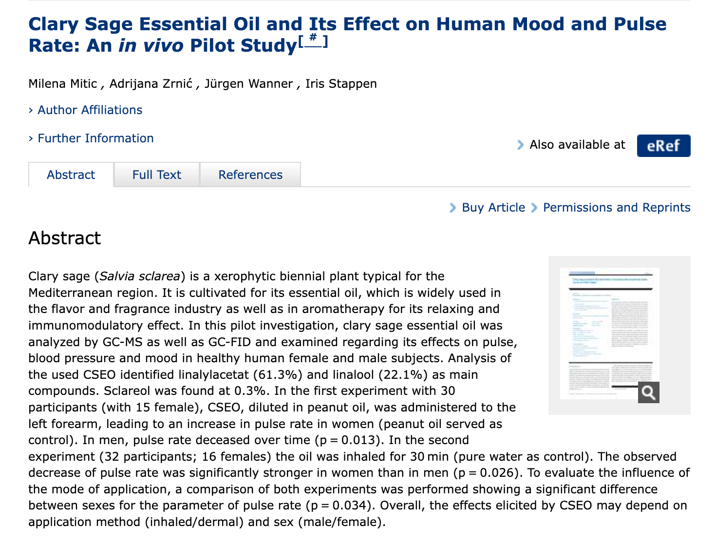 3. Mitic, M., Zrnić, A., Wanner, J. & Stappen, I., 2020. Clary Sage Essential Oil and Its Effect on Human Mood and Pulse Rate: An in vivo Pilot Study. Planta Medica, 86(15), pp.1125–1132. Available at: https://doi.org/10.1055/a-1211-6325