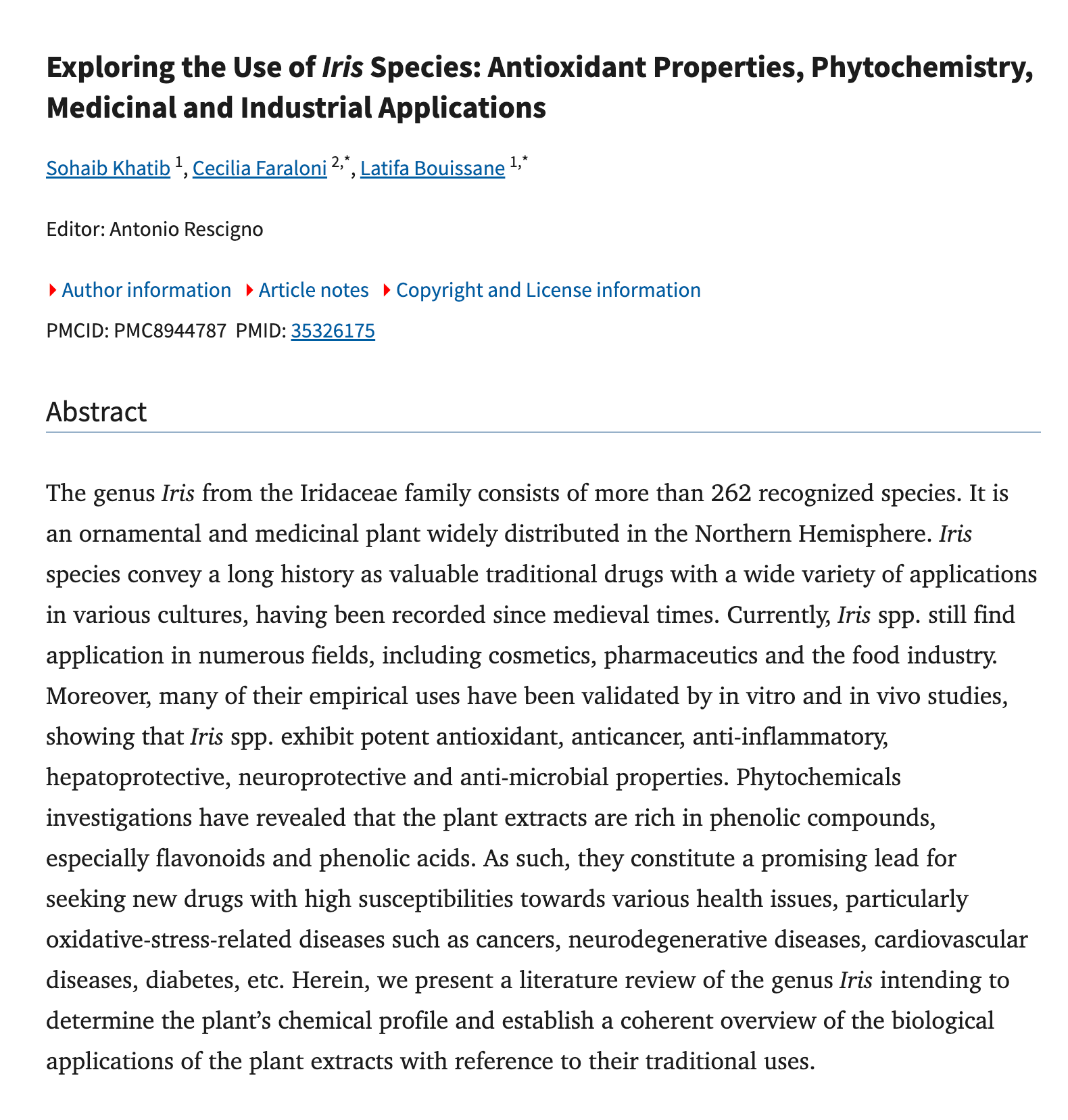 1. Khatib, S., 2022. Exploring the use of Iris species: antioxidant, anti-inflammatory, and neuroprotective potential. Chinese Herbal Medicines, Available at: https://www.ncbi.nlm.nih.gov/pmc/articles/PMC8944787/