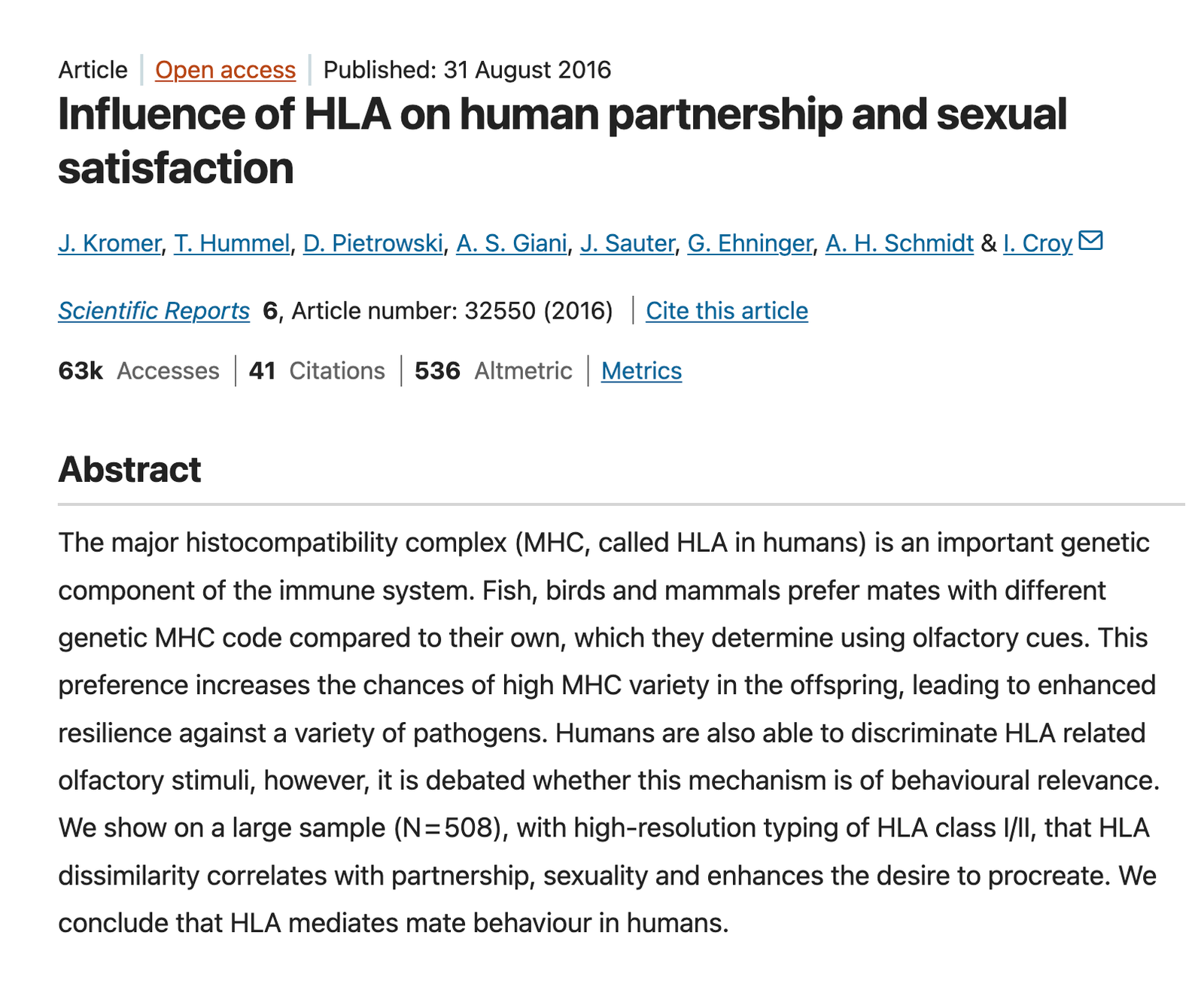 6. Kromer, J., Hummel, T., Pietrowski, D., Giani, A.S., Sauter, J., Ehninger, G., Schmidt, A.H. & Croy, I., 2016. Influence of HLA on human partnership and sexual satisfaction. Scientific Reports, Volume 6, Article 32550. Available at: https://www.nature.com/articles/srep32550