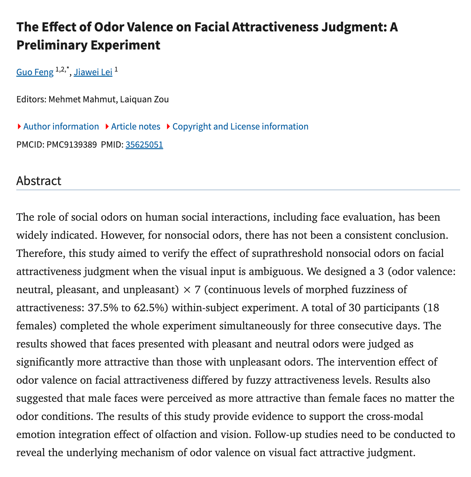 7. Li, S., Wei, Y., Wang, C., Yang, L., Zhao, S. & Fu, W., 2024. The effect of odor valence on facial attractiveness judgement. Neuroscience Letters, 816, 137083. Available at: https://pmc.ncbi.nlm.nih.gov/articles/PMC9139389/