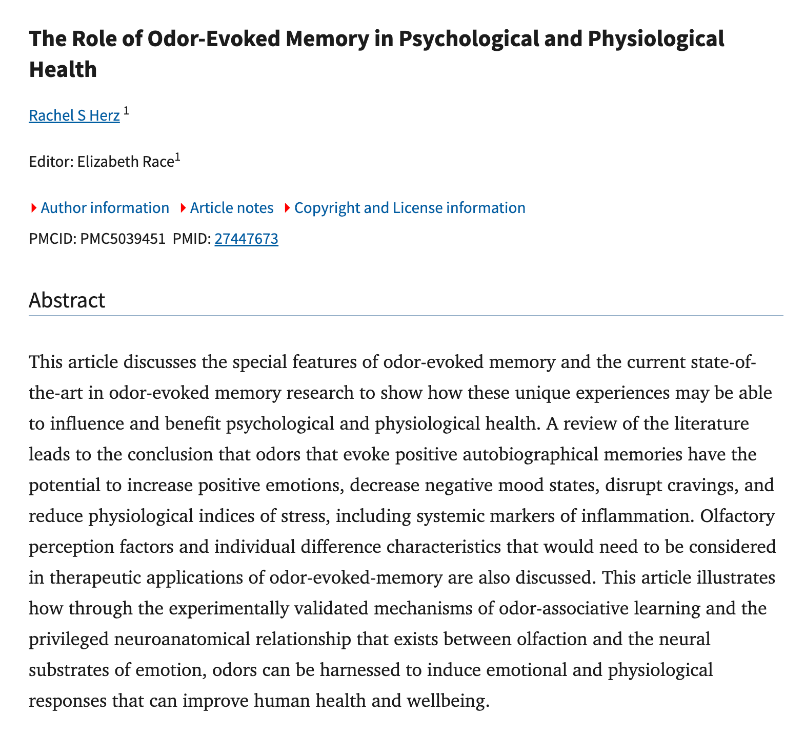 8. Herz, R.S., 2016. The role of odor-evoked memory in psychological and physiological health. Brain Sciences, 6(3), 22. Available at: https://pmc.ncbi.nlm.nih.gov/articles/PMC5039451/