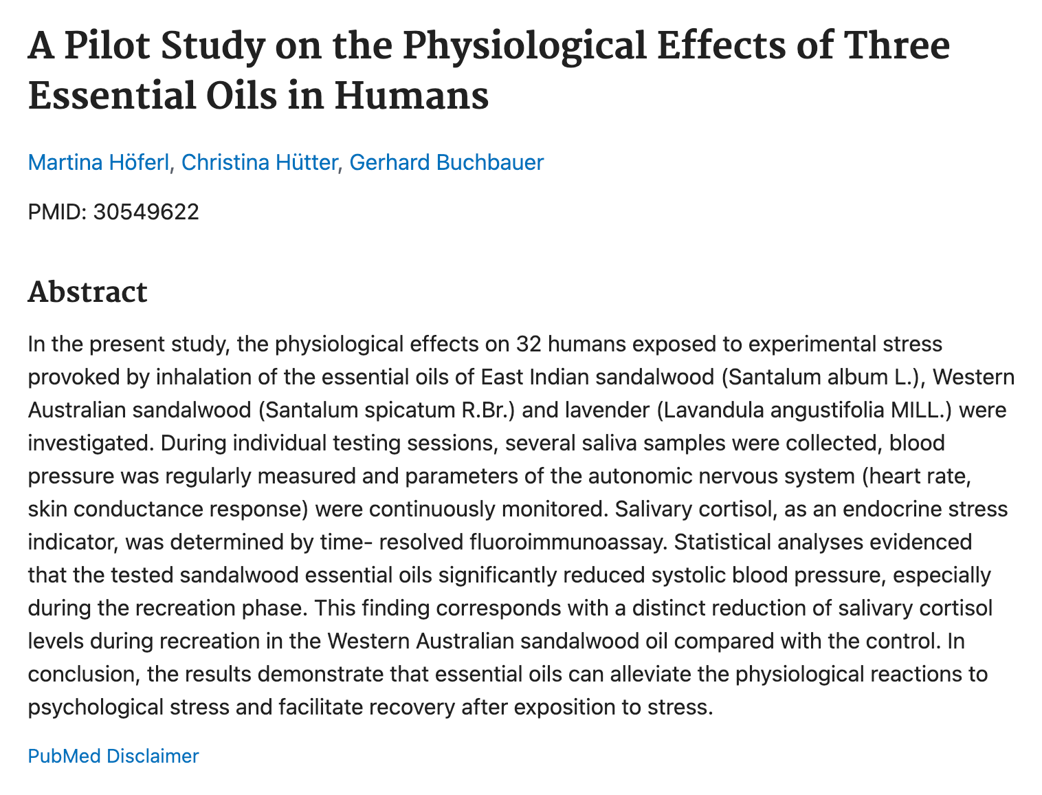 4. Höferl, M., Hütter, C., & Buchbauer, G., 2016. A pilot study on the physiological effects of three essential oils in humans (East Indian sandalwood, Western Australian sandalwood, and lavender). Natural Product Communications, 11(10), pp.1561–1564. Available at: https://pubmed.ncbi.nlm.nih.gov/30549622/