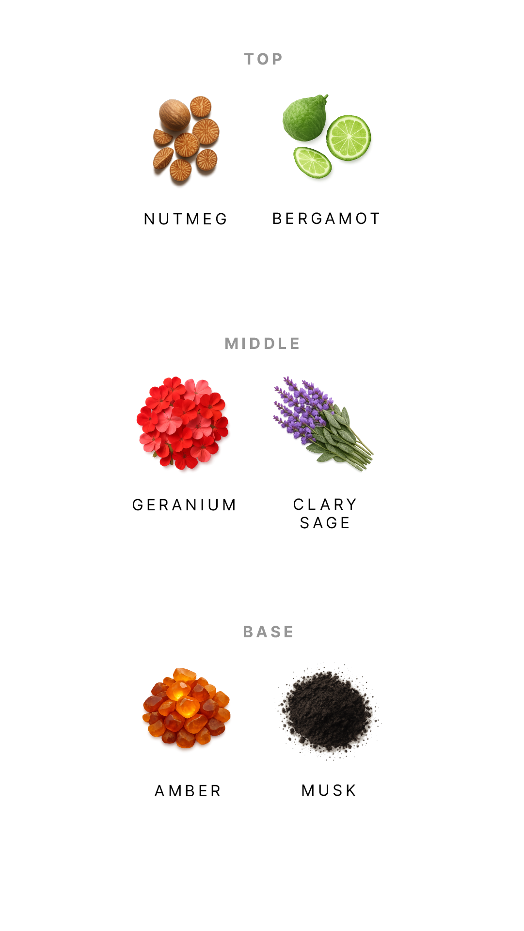 Green and floral, Geranium rises in the mid. It brings brightness and a touch of vibrancy, making the scent feel alive.