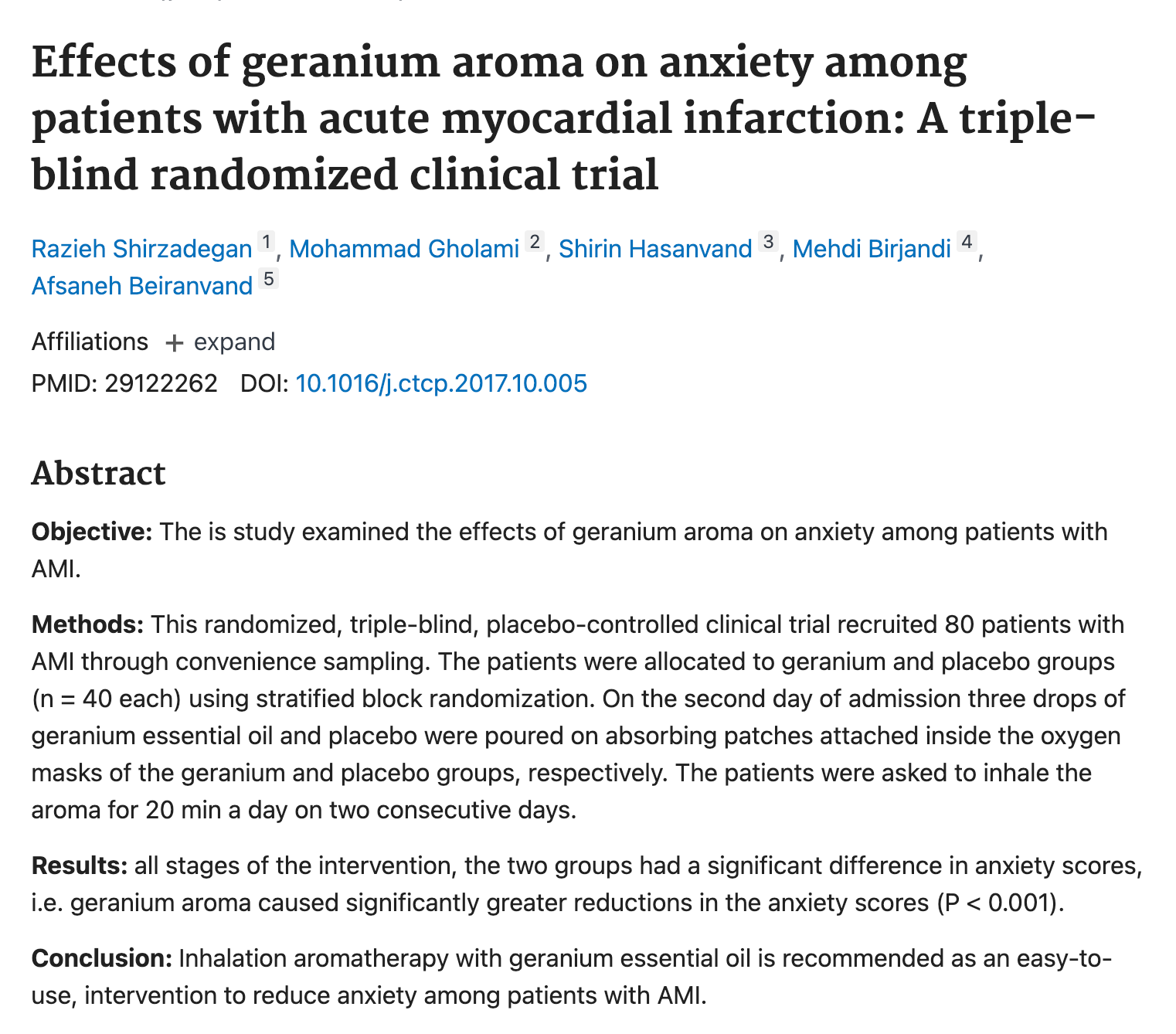 - Shirzadegan, R., Gholami, M., Hasanvand, S., Birjandi, M. & Beiranvand, A., 2017. Effects of geranium aroma on anxiety among patients with acute myocardial infarction: A triple-blind randomized clinical trial. Complementary Therapies in Clinical Practice, 29, pp.201–206. Available at: https://pubmed.ncbi.nlm.nih.gov/29122262/