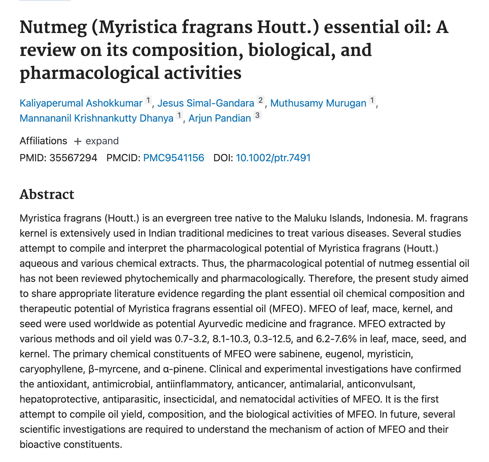 - Ashokkumar, K., Simal-Gandara, J., Murugan, M. & Dhanya, M.K., 2022. Nutmeg (Myristica fragrans Houtt.) essential oil: A review on its composition, biological, and pharmacological activities. Phytotherapy Research, 36(7), pp.2839–2851. Available at: https://pubmed.ncbi.nlm.nih.gov/35567294/